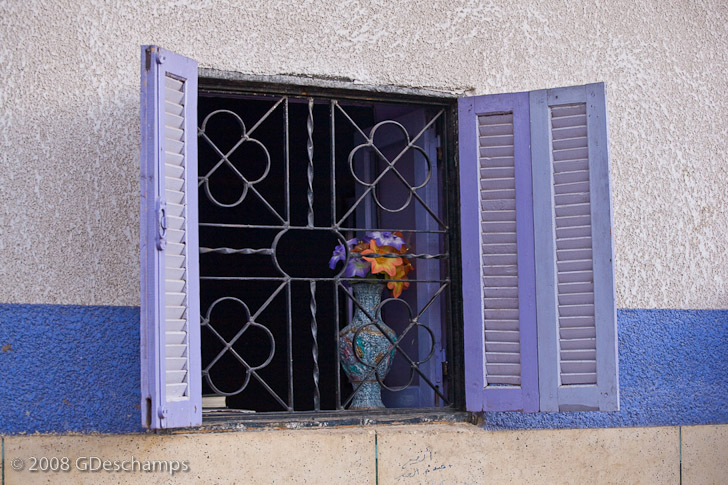 Flowers in vase on window sill, blue Nubian house, Elephantine Island