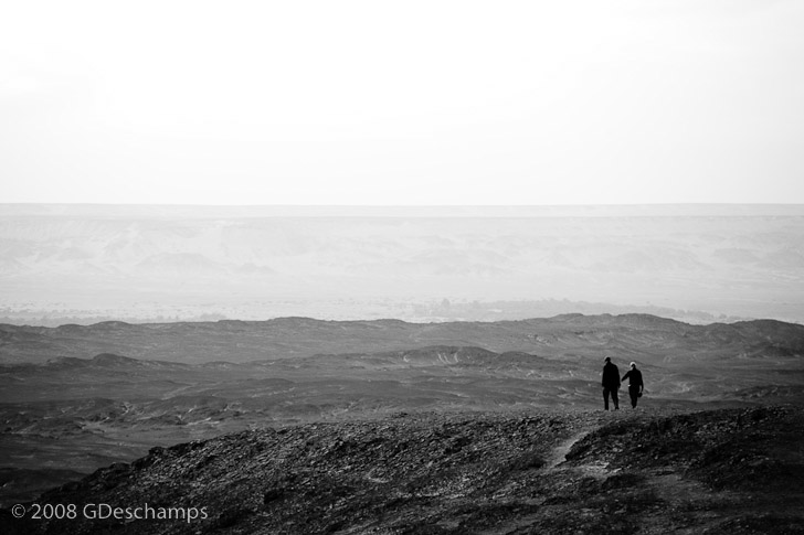Couple walking in the Black Desert at sunset