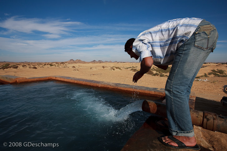 Bedouin refreshing himself at the water pool in the middle of the Bedouin village on the way to the White Desert, with the Black Desert in the background