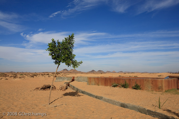 Lone tree near water pool in the Bedouin village near Bahariya Oasis, Black Desert in the background