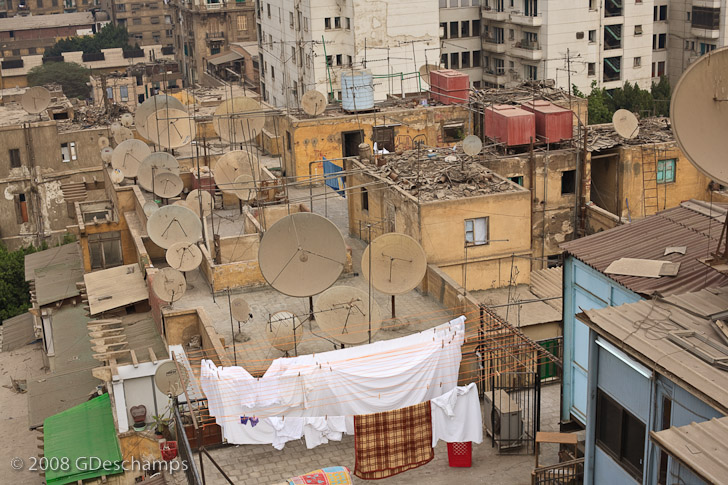 Rooftops of Cairo with satellite dishes and hanging laundry