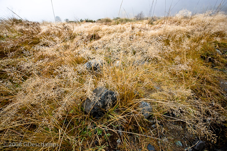Tussocks sprinkled with rain drops on the way to Milford Sound