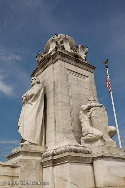 Columbus statue in Colombus Circle in Washington DC, with US flag in the background